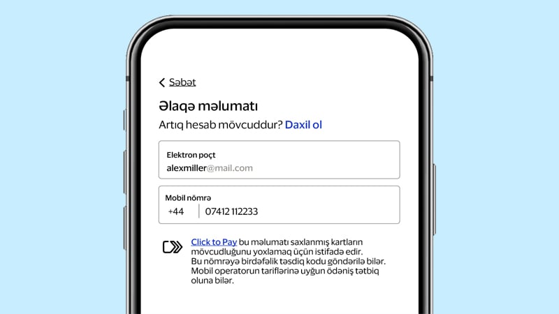 Sifarişi tərtib edərkən, elektron poçt ünvanınızı, yaxud mobil nömrənizi daxil edin və Click to Pay xidmətinə bağlı kartınızı tapın.